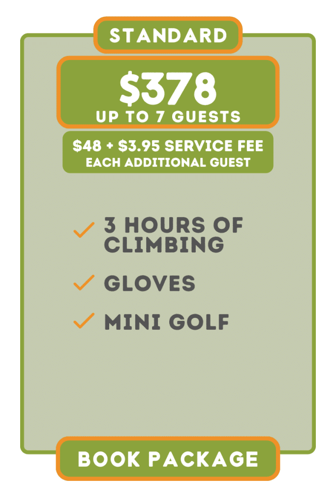 The Standard Birthday Party Package includes 2 Activities: 3-hour Aerial Forest session (30-minute safety orientation & the remaining time for climbing) and a round of mini golf for all participants.