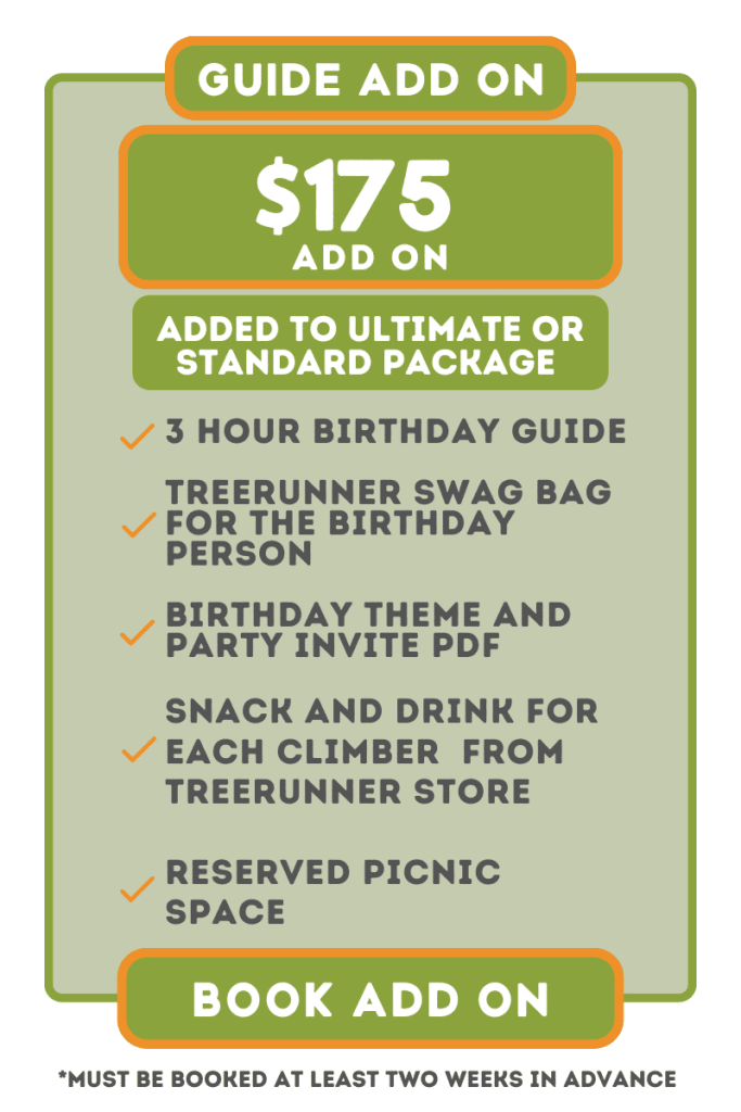 Personal Party Guide: Enjoy two hours of fun with a dedicated personal guide to assist your group! We’ll provide a reserved picnic space complete with covers, plates, cups, silverware, and a special TreeRunner swag bag for the birthday climber. Each participant can choose their own snack and drink from our store, and we’ll even help you get the party started with a PDF invitation template and themed decoration options.