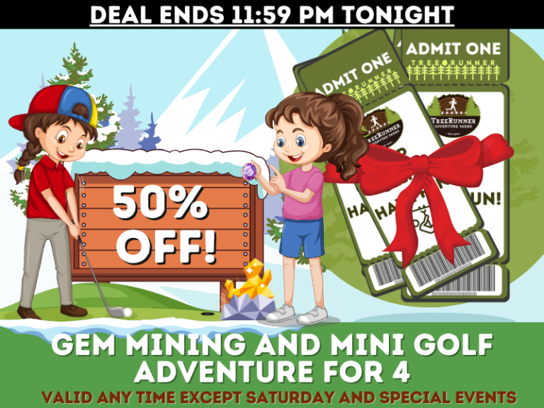 Take advantage of our special 50% off ‘Family Golf & Gem Adventure for Four’ package! This exclusive deal includes 8 versatile codes/vouchers, each redeemable for either a round of mini-golf or a ‘pay dirt’ gem mining experience.