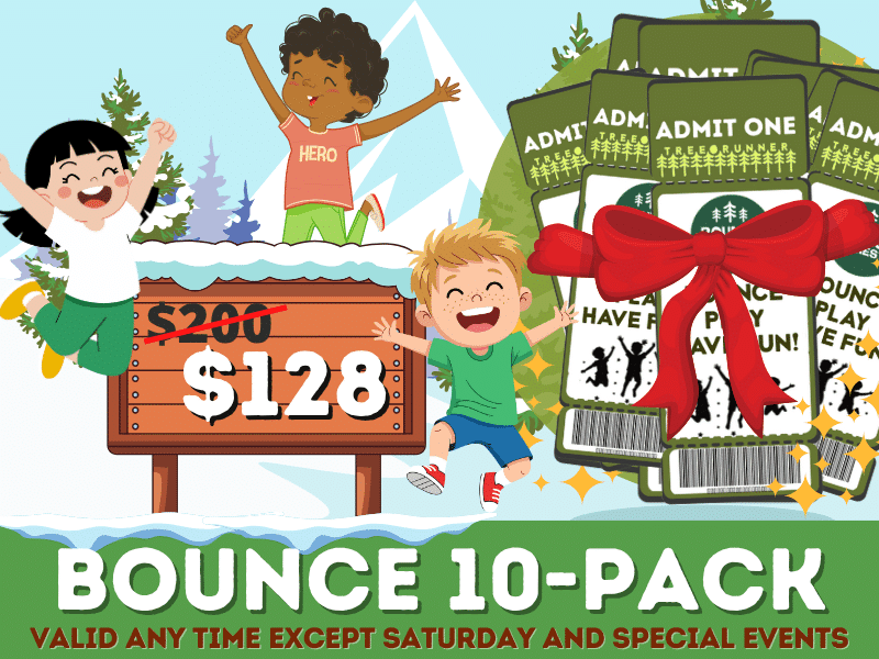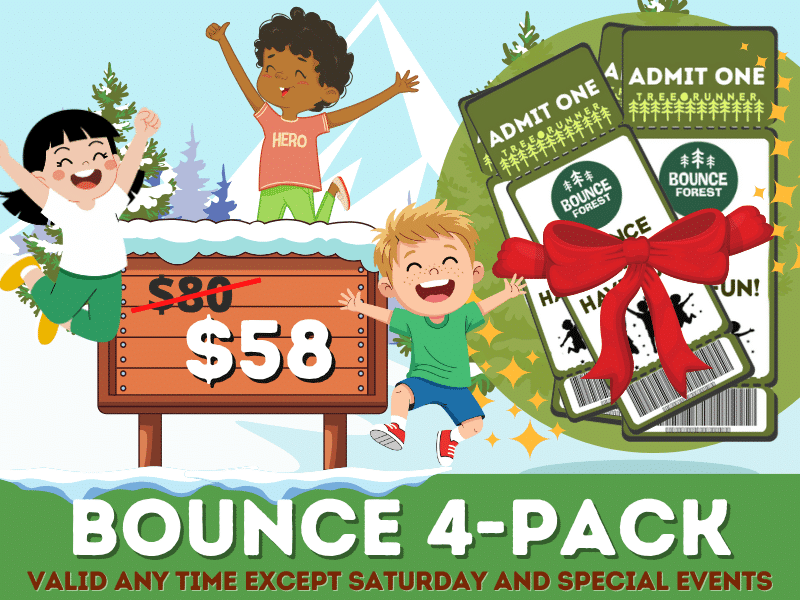 Get four 30-minute bounce sessions in our NEW Bounce Forest at 30% off! A great way to enjoy more time in the trees or share the fun!