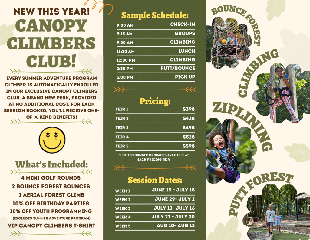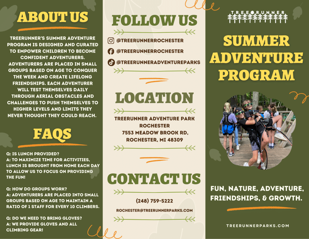 Space will be limited so secure your child’s spot today! Adventurers will enjoy spending time each day climbing through the trees at one of Michigan’s largest adventure parks, making friendships, and building confidence, all while enjoying nature and staying active and fit!