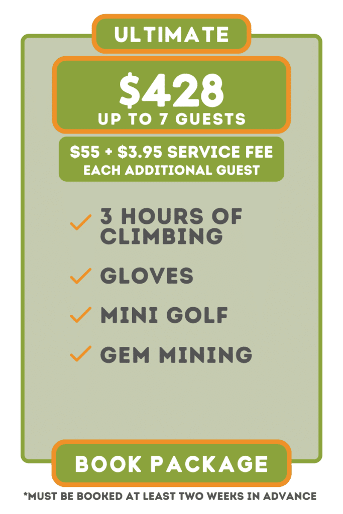 The Ultimate Birthday Party Package includes 3 Activities: 2-hour Junior Park climbing session (15-minute safety orientation & the remaining time for climbing), a round of mini golf, and a 3lb bag of Gem Mining Pay Dirt for all participants.
