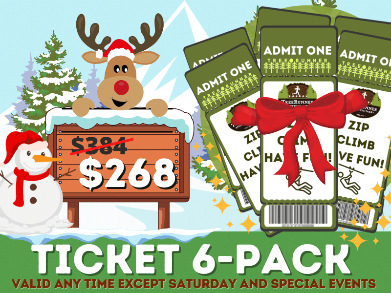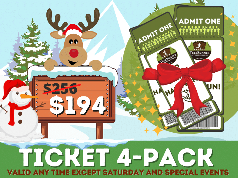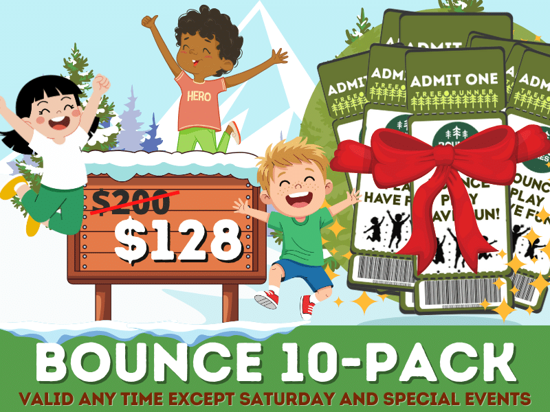 Get four 30-minute bounce sessions in our NEW Bounce Forest at 30% off!  A great way to enjoy more time in the trees or share the fun!